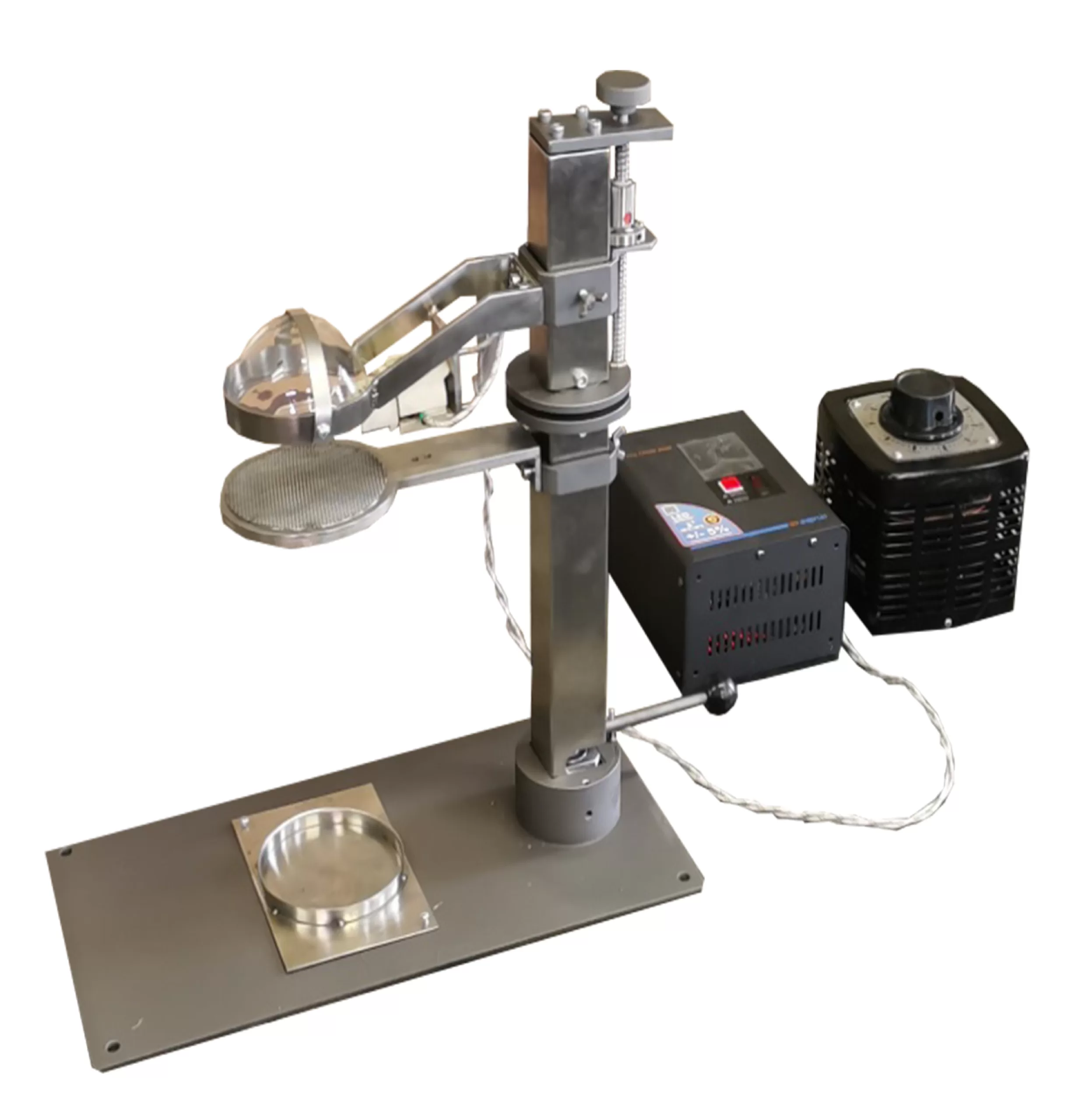Установка предназначена для определения характеристик плавления материалов согласно Правилу №118 ООН (Приложение 7). Испытание проводится на четырех образцах, причем с обеих сторон (если они различаются). Образец закрепляется горизонтально и подвергается воздействию электрического калорифера. Под образцом помещается резервуар для улавливания образующихся капель. Резервуар заполняется хлопковой ватой, позволяющей определить, являются ли эти капли воспламеняемыми. Источником тепла является электрический калорифер с полезной мощностью 500 Вт. Тепловыделяющая поверхность представляет собой прозрачную кварцевую пластину в виде полусферы диаметром 100 ± 5 мм.